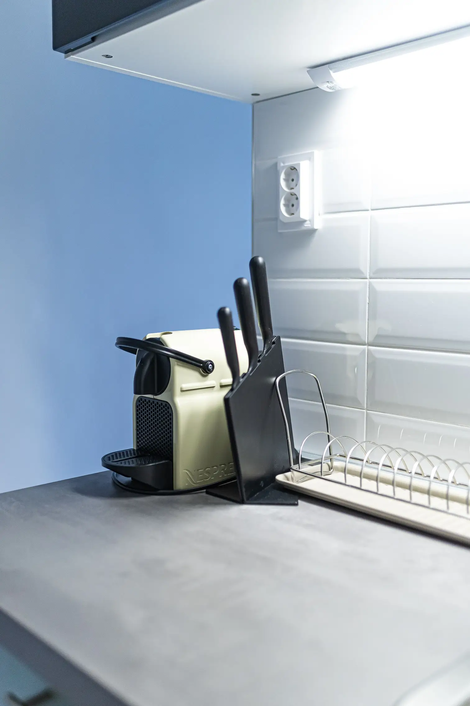 Az apartman teakonyhájában beépített fagyasztós hűtő, Nespresso kávéfőző és mikrohullámú sütő áll a vendégek rendelkezésére. A felszereltség része több féle tányér, poharak és csészék, valamint evőeszközök és kések. Főzési lehetőség nincs.